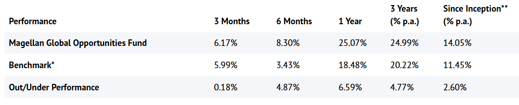 Philosophy, process and execution come together in the Magellan Global Opportunities Fund. Since inception, the fund has delivered 14.05% per annum net of fees, outperforming the benchmark index by 2.6%. Over the past three years the fund has delivered 24.99% per annum net of fees, again beating the benchmark index by 4.77%#.